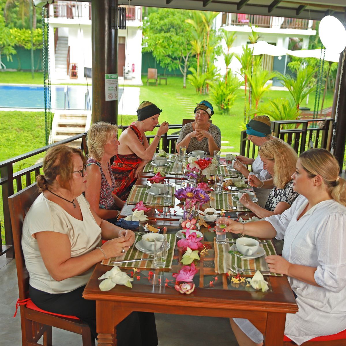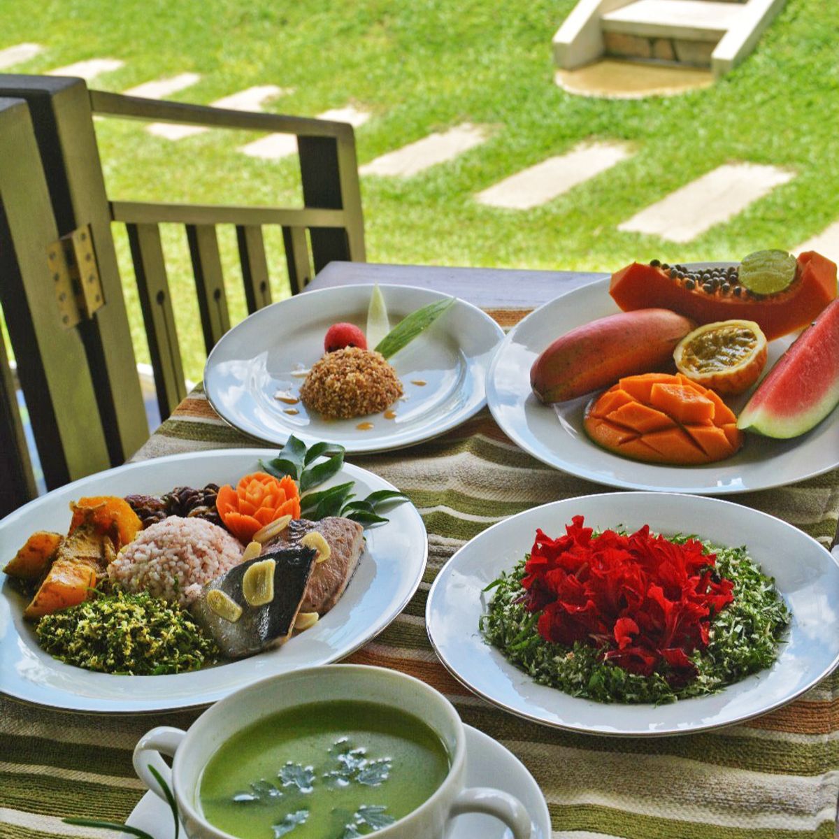 Das offene Restaurant serviert schmackhafte, ayurvedische Speisen nach Empfehlung des Ayurveda-Arztes und individuell auf den Dosha-Typ abgestimmt. Die Mahlzeiten werden als Menü gereicht. Um die Ernährung auch im Alltag typgerecht zu gestalten, erhalten die Gäste Empfehlungen zu geeigneten Zutaten, Gewürzen und Zubereitungsformen.