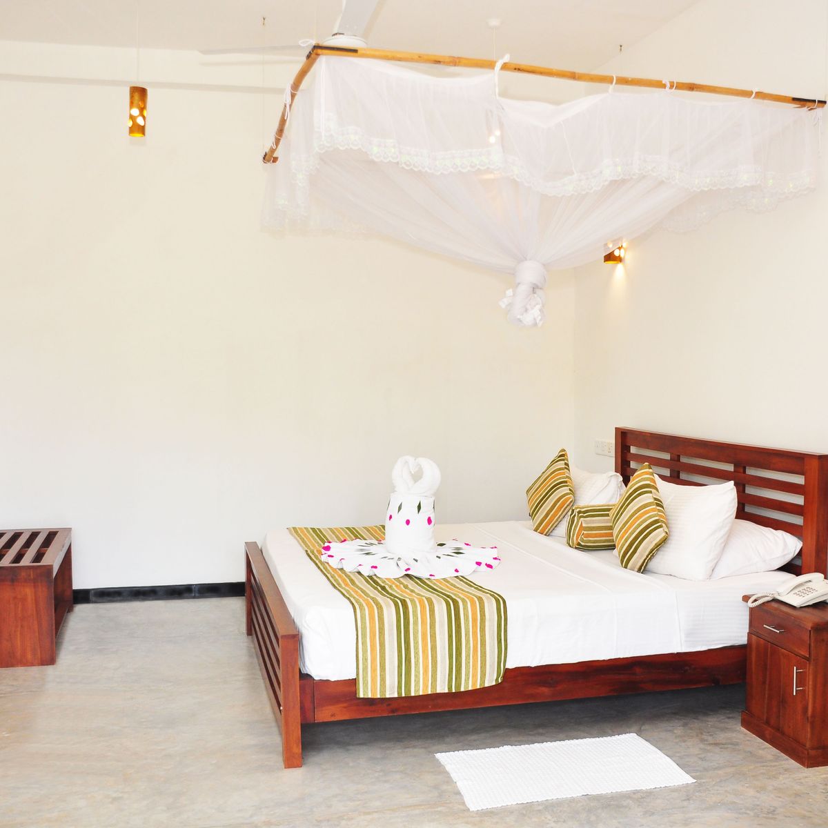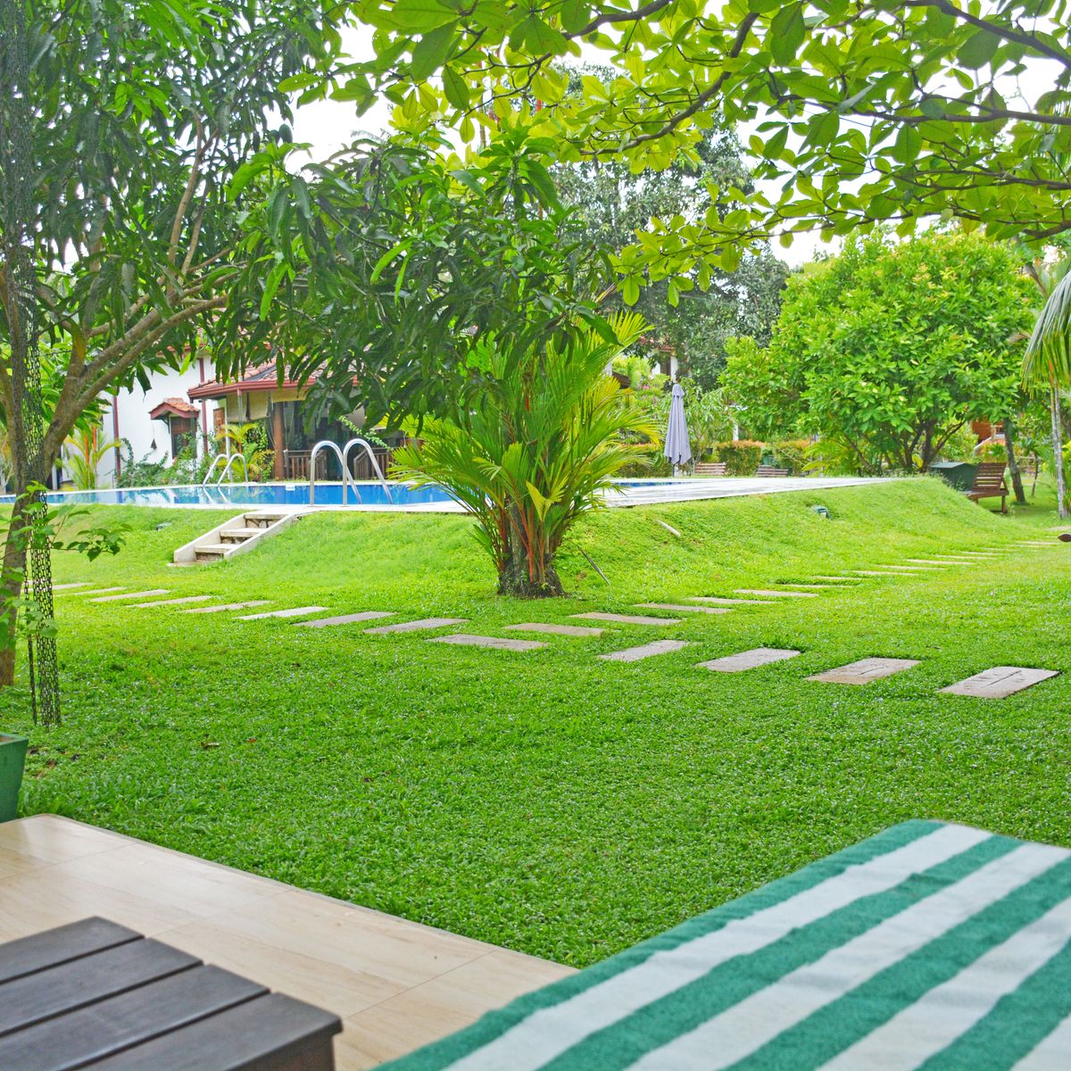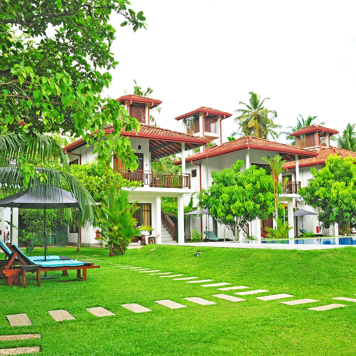 Verteilt über 8 Bungalows bieten die insgesamt 22 Zimmer auf 2 Etagen ausreichend Freiraum und eine äußerst familiäre Atmosphäre. Vom Balkon bzw. der Terrasse mit Sitzgelegenheit schweift der Blick über den Pool in das satte Grün des Gartens. Ausgestattet sind die Zimmer mit Dusche/WC, Ventilator, Telefon, Safe, Föhn, Bademantel, Klimaanlage und WLAN. 1 weiterer Bungalow mit 2 Zimmern ist auf Anfrage buchbar.