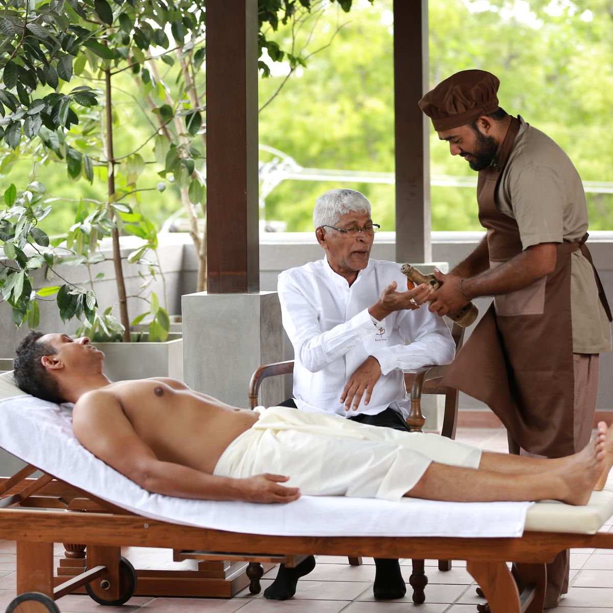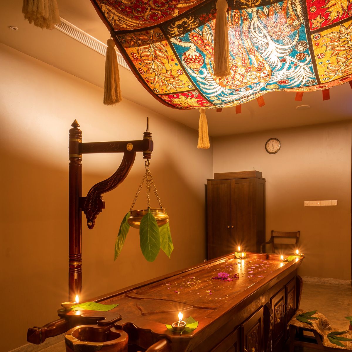 Die 12 Behandlungsräume bieten eine angenehme Atmosphäre während der Therapien. Nach einer ersten Untersuchung durch den Arzt werden die Behandlungen individuell auf die Gäste abgestimmt, um Krankheiten effektiv zu behandeln. Zu den Therapien zählen unter anderem Kopf-, Gesichts-, Körper- und Fußmassagen, Ölanwendungen und wärmende Kräuterbäder. Auch Yoga und Meditation sind integraler Bestandteil des Programms. Das Zentrum legt Wert auf Nachhaltigkeit und minimiert den Einsatz von Plastik bei den Anwendungen. Täglich werden begleitende Yoga- und Meditationseinheiten angeboten.