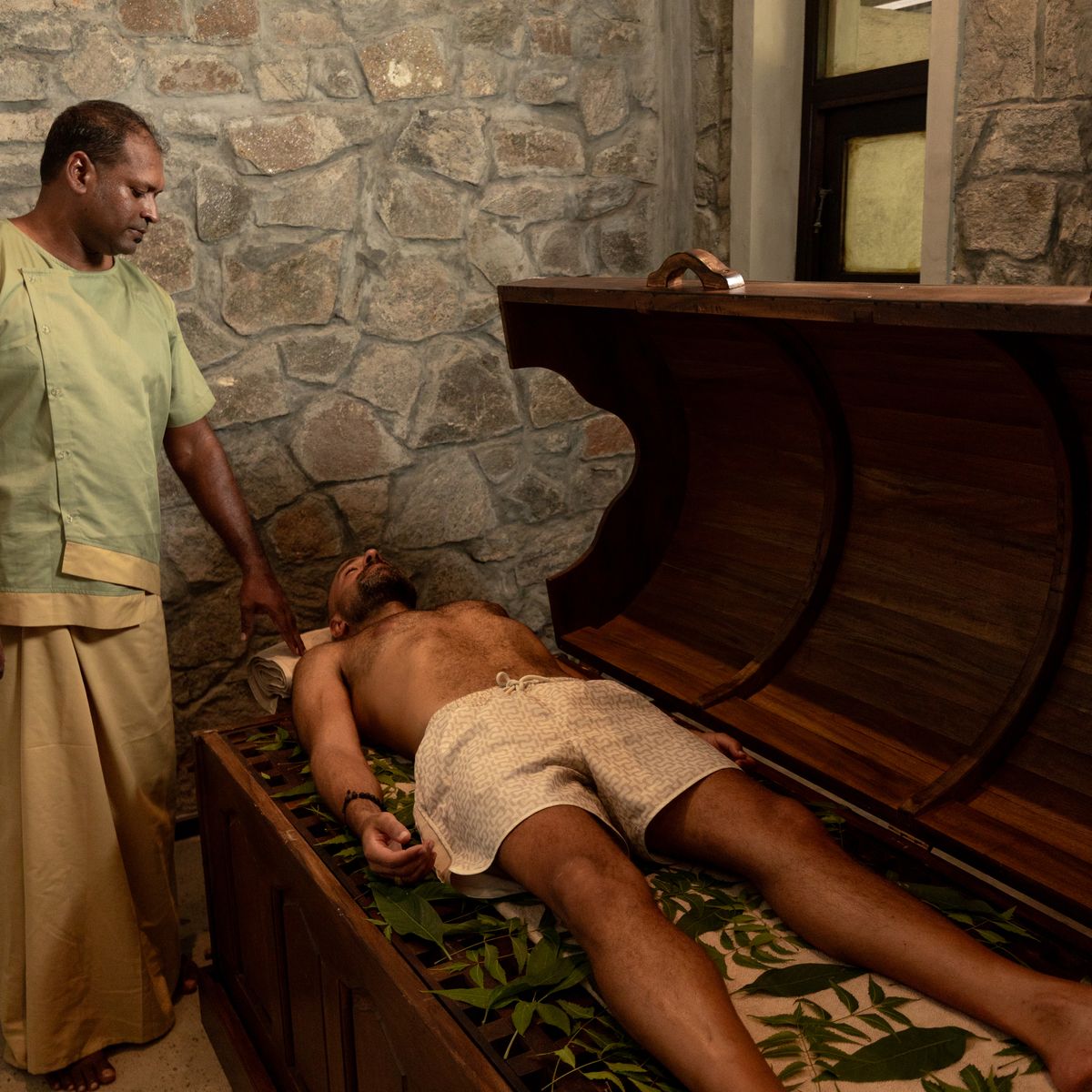Entspannung und traditionelle ayurvedische Therapien umgeben von tropischer Natur