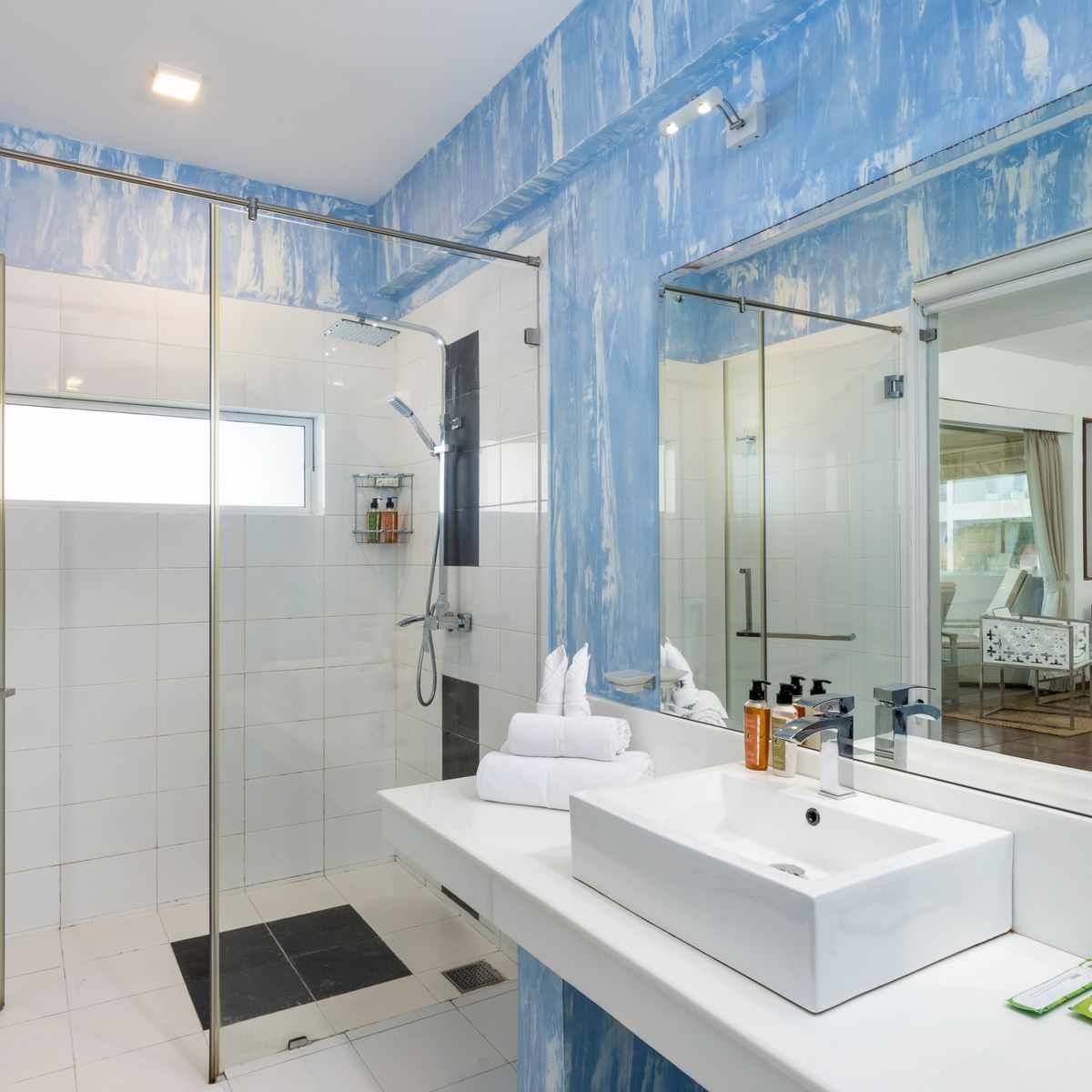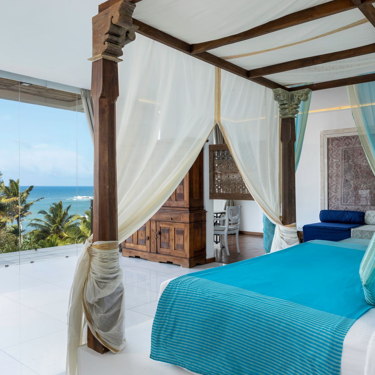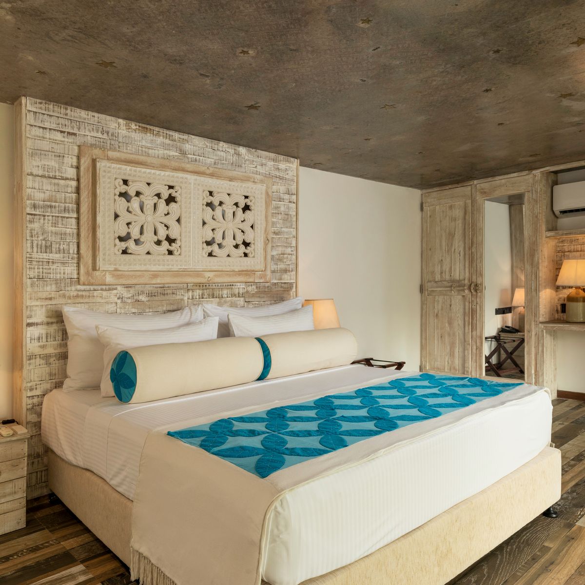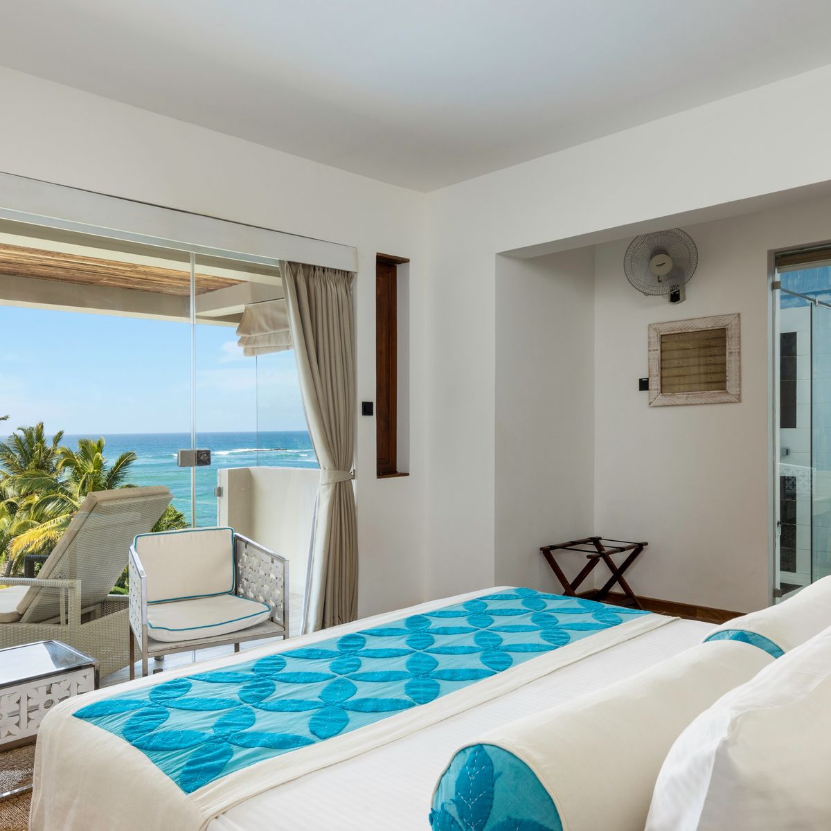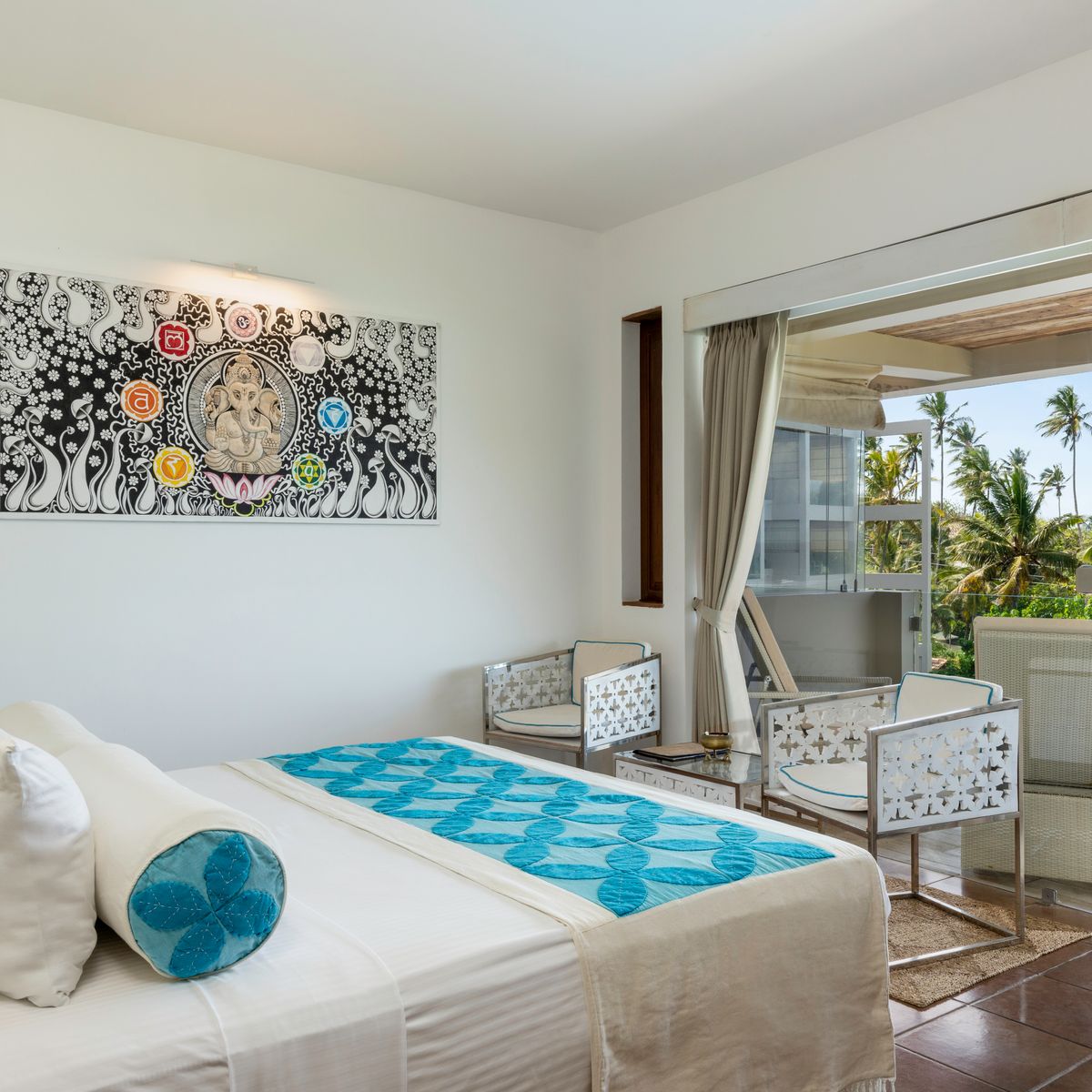 In 22 Deluxe Zimmern können Gäste einen herrlichen Meerblick direkt vom Bett oder sogar aus der Dusche heraus erleben. Die Räumlichkeiten kombinieren moderne mit traditionellen Elementen und sind in Farben gehalten, die an die Doshas erinnern, um eine beruhigende Atmosphäre zu schaffen. Für Alleinreisende gibt es drei Einzelzimmer mit französischem Bett und privater Terrasse, die sich im Untergeschoss befinden und auf einen grünen Innenhof ausgerichtet sind - perfekt für jene, die Stille und einen Rückzugsort suchen. Trotzdem empfehlen wir eher die Wahl eines Doppelzimmers zur Alleinbenutzung, da diese einen Meerblick bieten. Zwei Suiten mit Blick auf das Meer und zwei separate Garden Lofts bieten zusätzlichen luxuriösen Komfort. Yogamatten sind in allen Zimmern verfügbar.