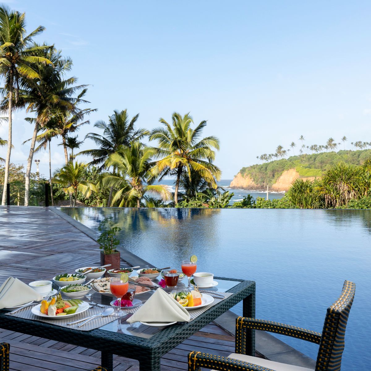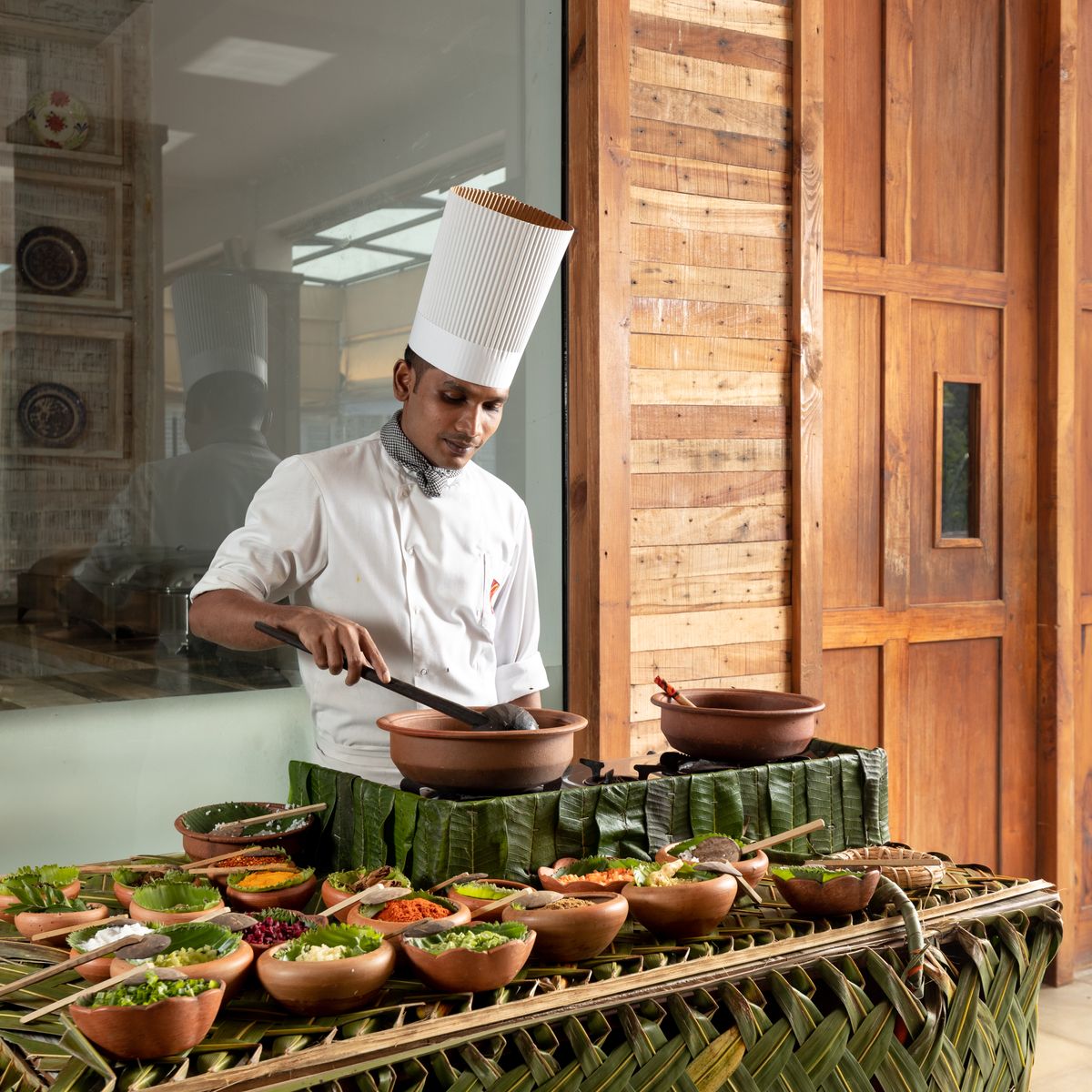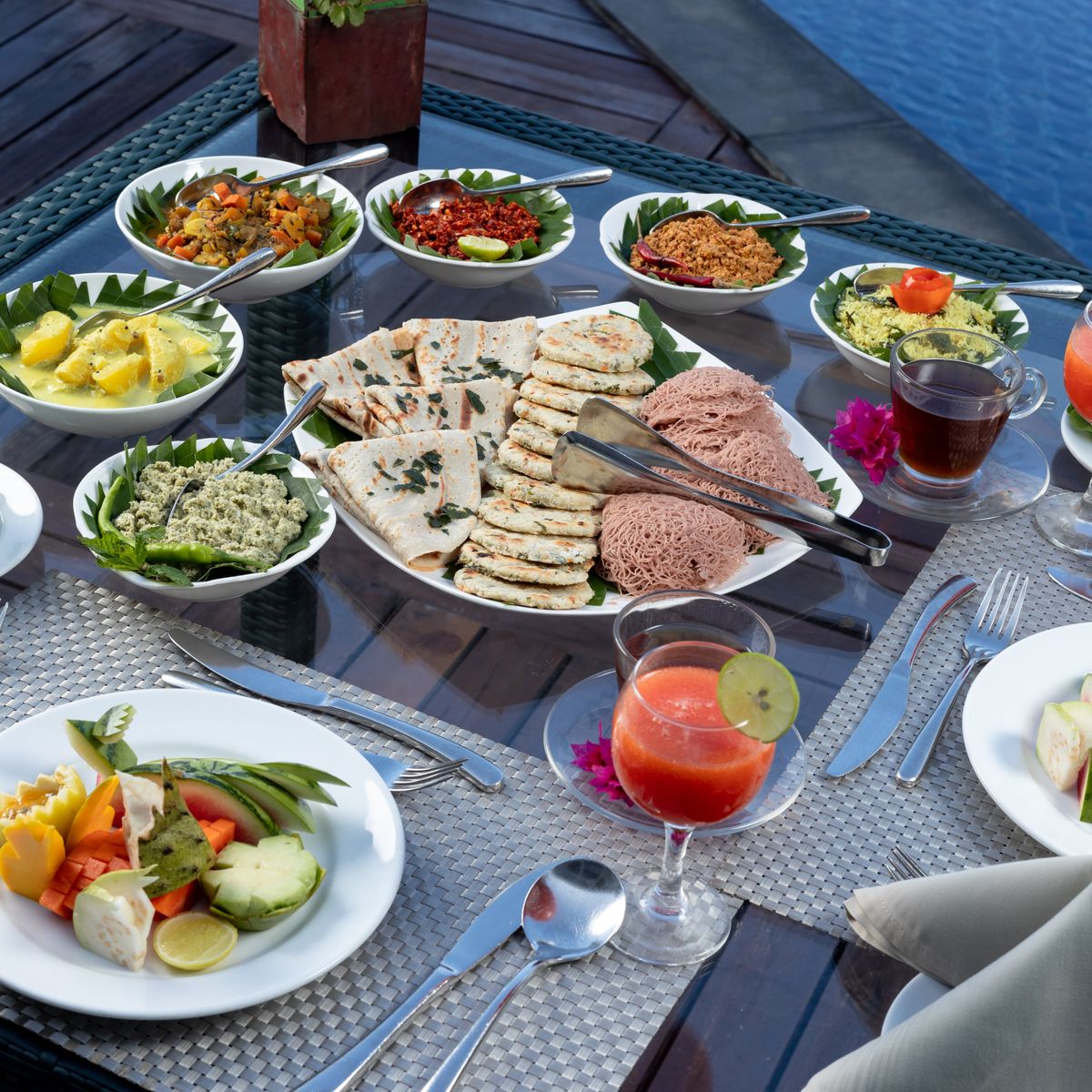 Die ayurvedische Küche wird im Restaurant oder auf der Terrasse mit Blick auf den Infinity Pool und den Indischen Ozean serviert. Genießen Sie doshagerechte, vegetarische Mahlzeiten, die das Körperfeuer "Agni" stärken und die Energie im Körper erhöhen. Frische Früchte, Gemüse-Curries und exotische Kräuter sorgen für Geschmackserlebnisse. Einige Zutaten stammen aus dem eigenen organischen Anbau des Bimbarama Tempelgartens in Ahangama.