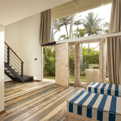 22 Deluxe Zimmer bieten einen atemberaubenden Meerblick, den Sie direkt vom Bett oder aus der Dusche genießen können. Die Wohnräume vereinen mühelos moderne und traditionelle Designelemente und sind in Farbtönen gestaltet, die sich auf die Doshas beziehen und eine beruhigende Atmosphäre schaffen. Für Alleinreisende stehen drei große Einzelzimmer mit französischem Bett und eigener Terrasse zur Verfügung. Diese Zimmer bieten einen Blick auf den begrünten Innenhof und ermöglichen einen entspannten Aufenthalt. Zwei Suiten mit Meerblick sowie zwei alleinstehende Garden Lofts bieten zusätzlichen luxuriösen Komfort. Yogamatten stehen in allen Zimmern zur Verfügung.