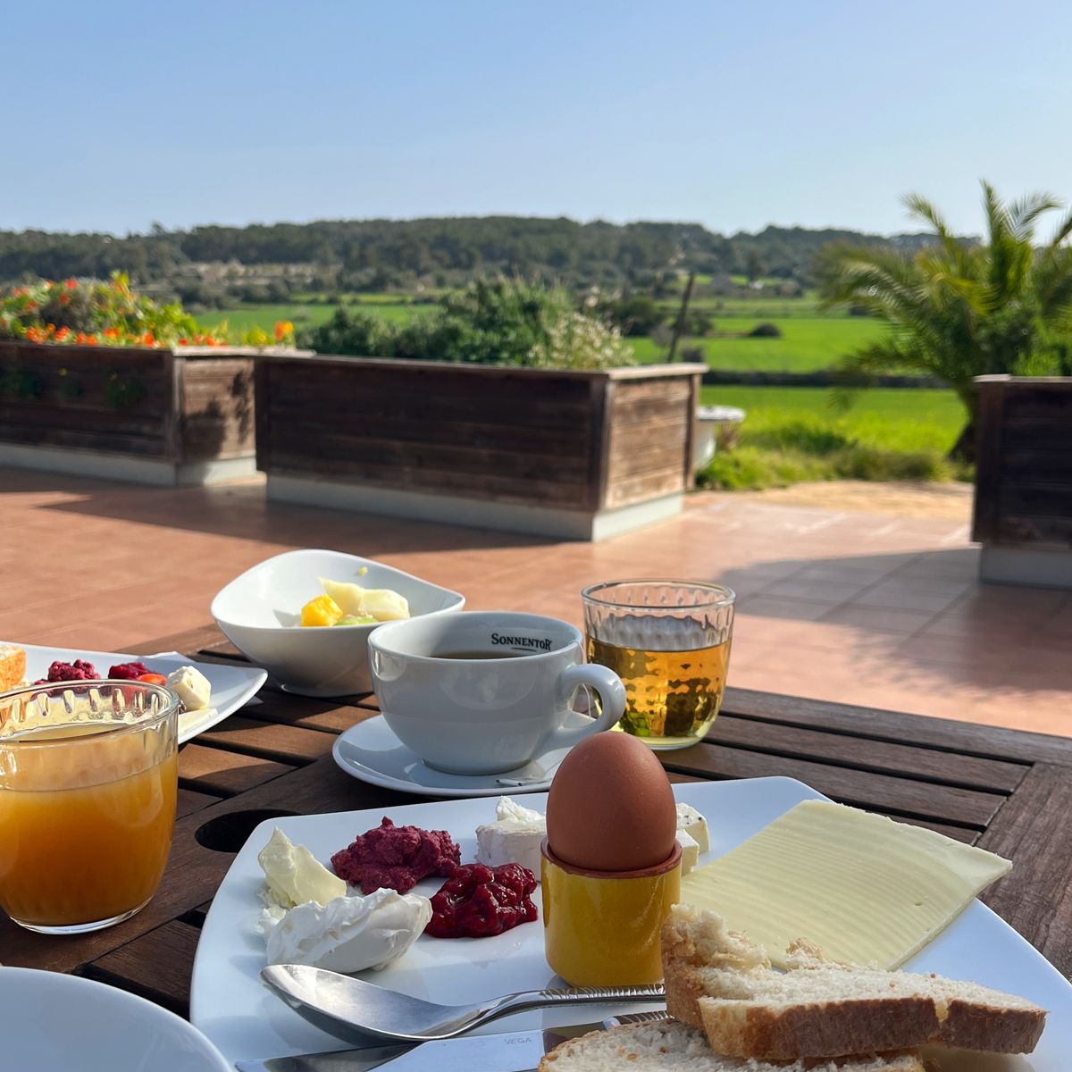 Als Mitglied der Veggie Hotels bietet die Finca ausschließlich vegetarische und vegane Kost an. Das reichhaltige Frühstück wird bis 11 Uhr auf der Terrasse serviert, von wo aus man den Blick über Palmen bis zum Dorf schweifen lassen kann. Zum Frühstück gibt es Sonnentor-Tee, Kaffee, Fruchtsäfte, Früchte, regionalen Käse, saisonales Gemüse, hausgemachte Marmeladen, Müsli, Porridge und hausgebackenes Brot. Um 14 Uhr werden Suppe und Salat serviert, und das Abendessen um 19 Uhr bietet eine Auswahl an vegetarisch-veganen Gerichten. Viele der verwendeten Kräuter stammen aus dem eigenen Garten, und je nach Saison gibt es Orangen, Zitronen, Feigen und Granatäpfel. Tee und Wasser sind den ganzen Tag über kostenlos verfügbar. Gäste sollten Unverträglichkeiten oder Allergien im Voraus mitteilen.