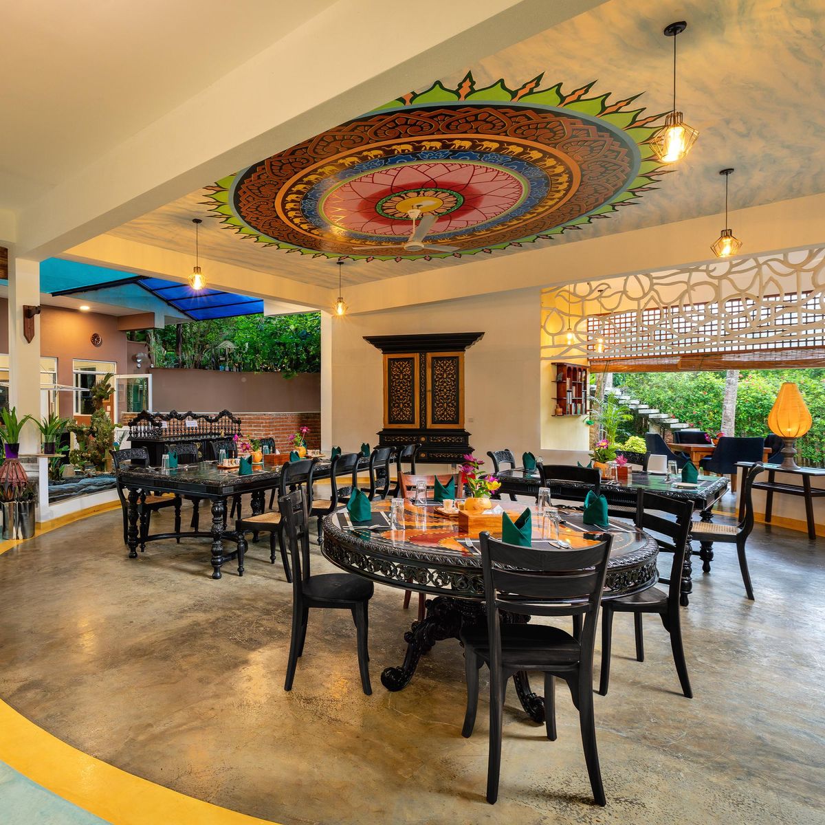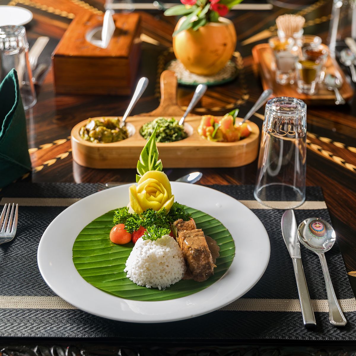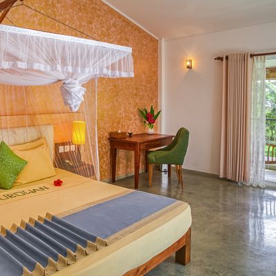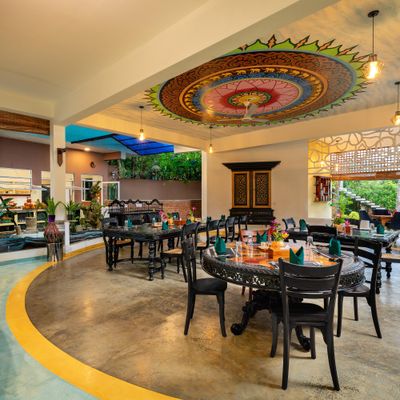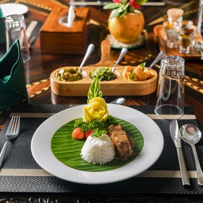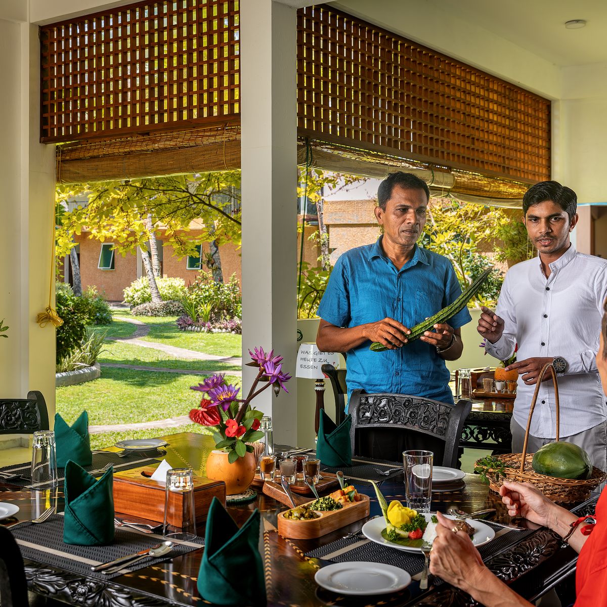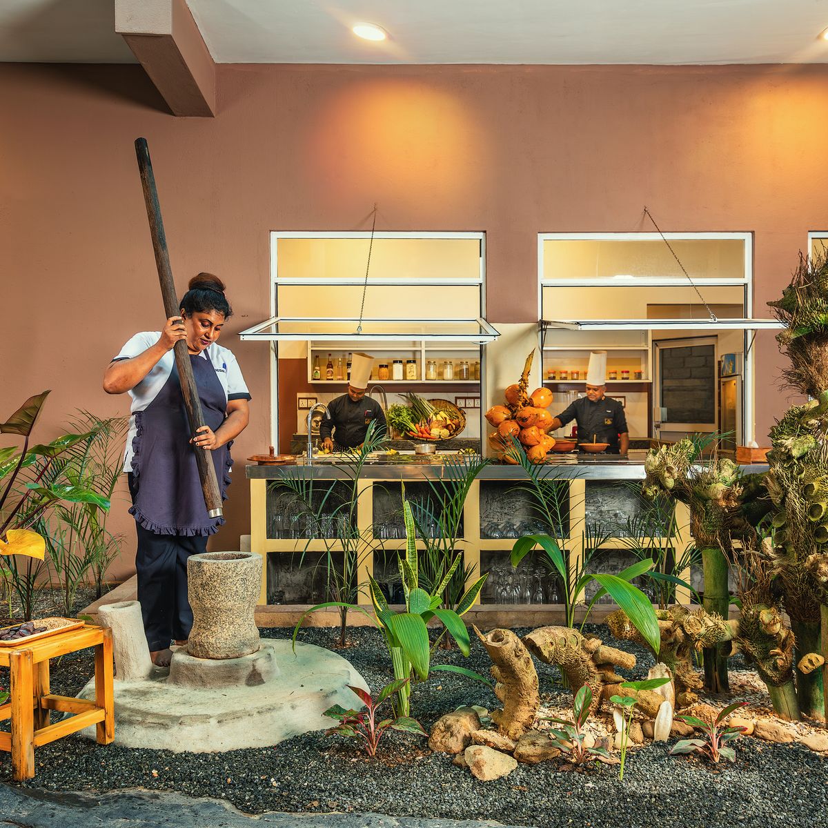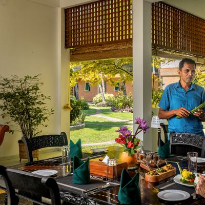 Im offen gestalteten Restaurant im Erdgeschoss, das durch seine kunstvollen Wandmalereien besticht, werden Ihnen singhalesische und ayurvedische Speisen als Menü angeboten, wobei Sie zwischen vegetarischen Optionen und teilweise weißem Fisch wählen können. Einige Zutaten kommen aus dem Gemüsegarten des Hotels. Gäste sind eingeladen, selbst Gemüse zu ernten, welches dann von der Hotelküche zubereitet wird.