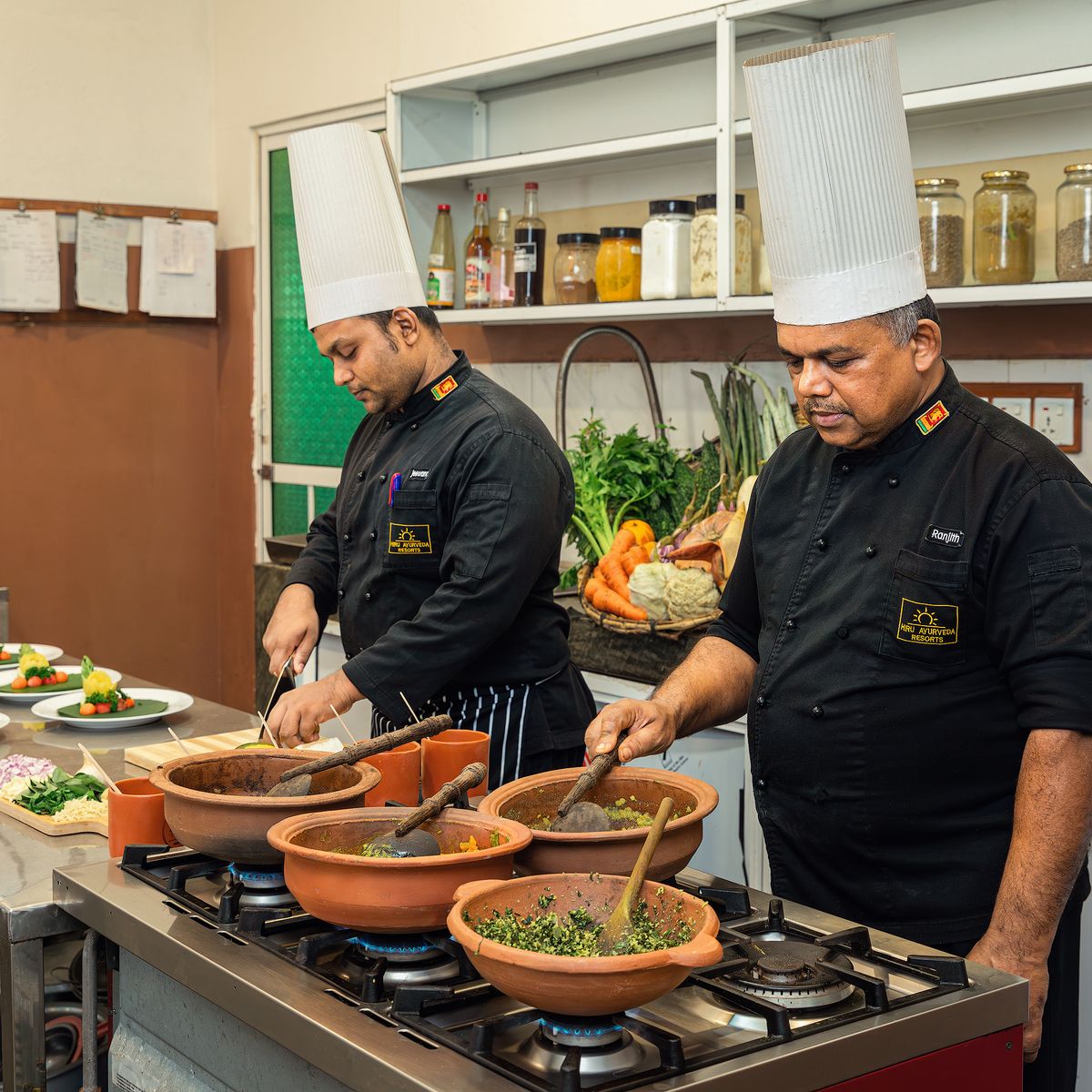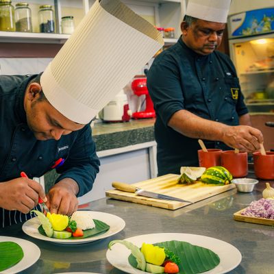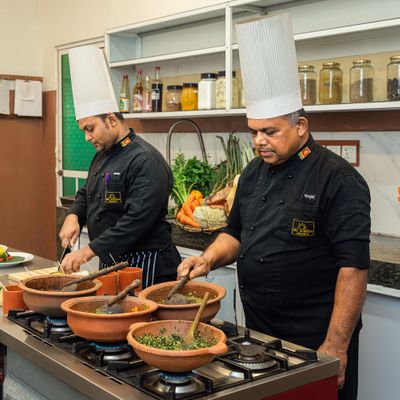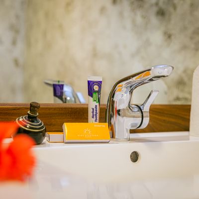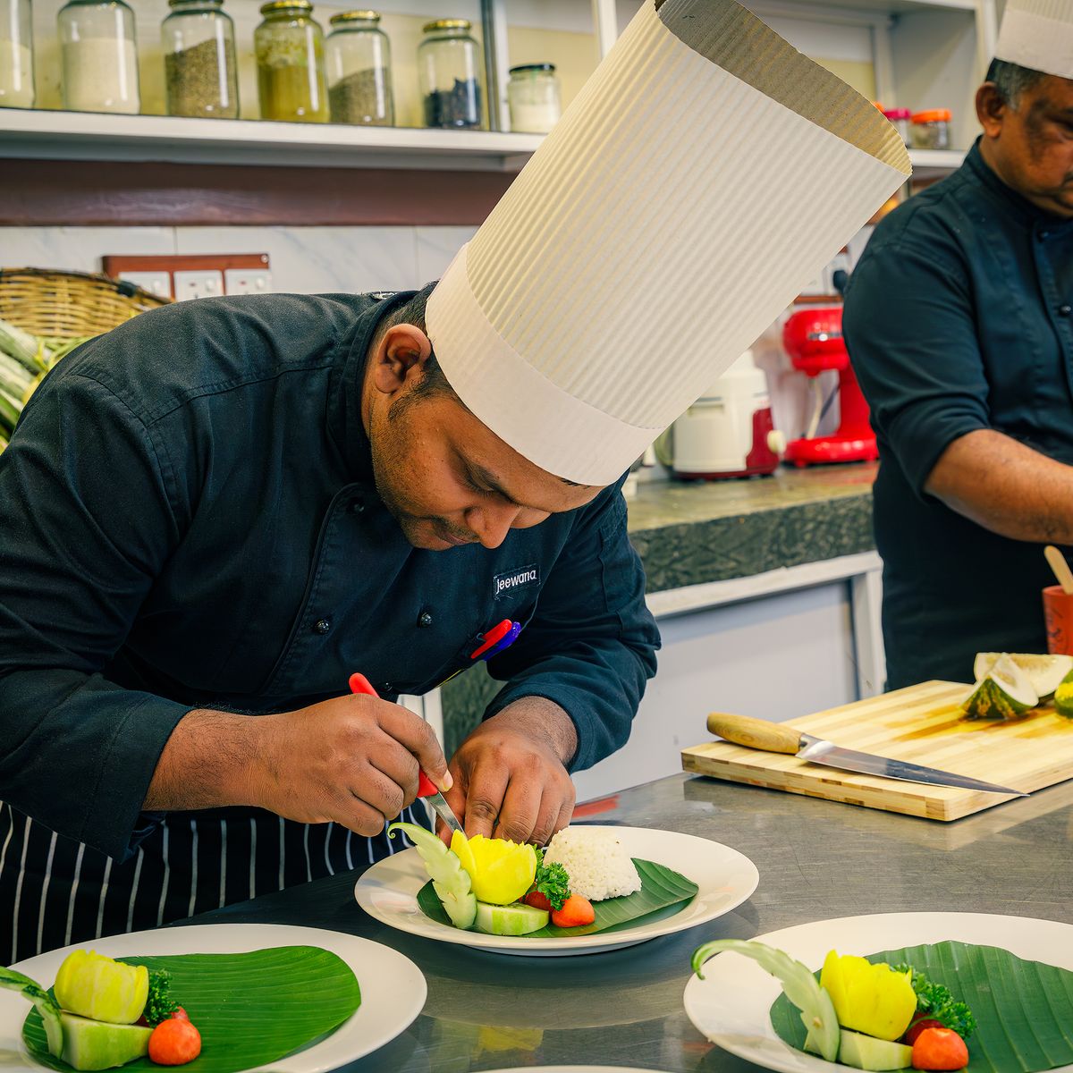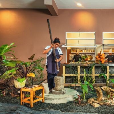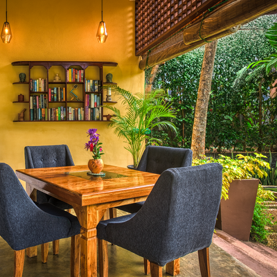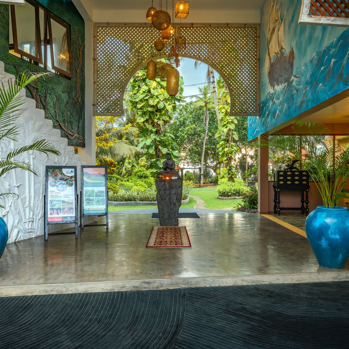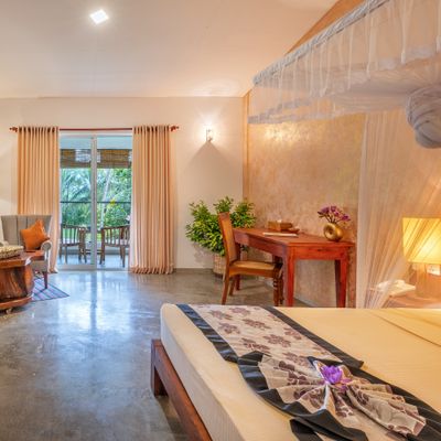 Im offen gestalteten Restaurant im Erdgeschoss, das durch seine kunstvollen Wandmalereien besticht, werden Ihnen singhalesische und ayurvedische Speisen als Menü angeboten, wobei Sie zwischen vegetarischen Optionen und teilweise weißem Fisch wählen können. Einige Zutaten kommen aus dem Gemüsegarten des Hotels. Gäste sind eingeladen, selbst Gemüse zu ernten, welches dann von der Hotelküche zubereitet wird.