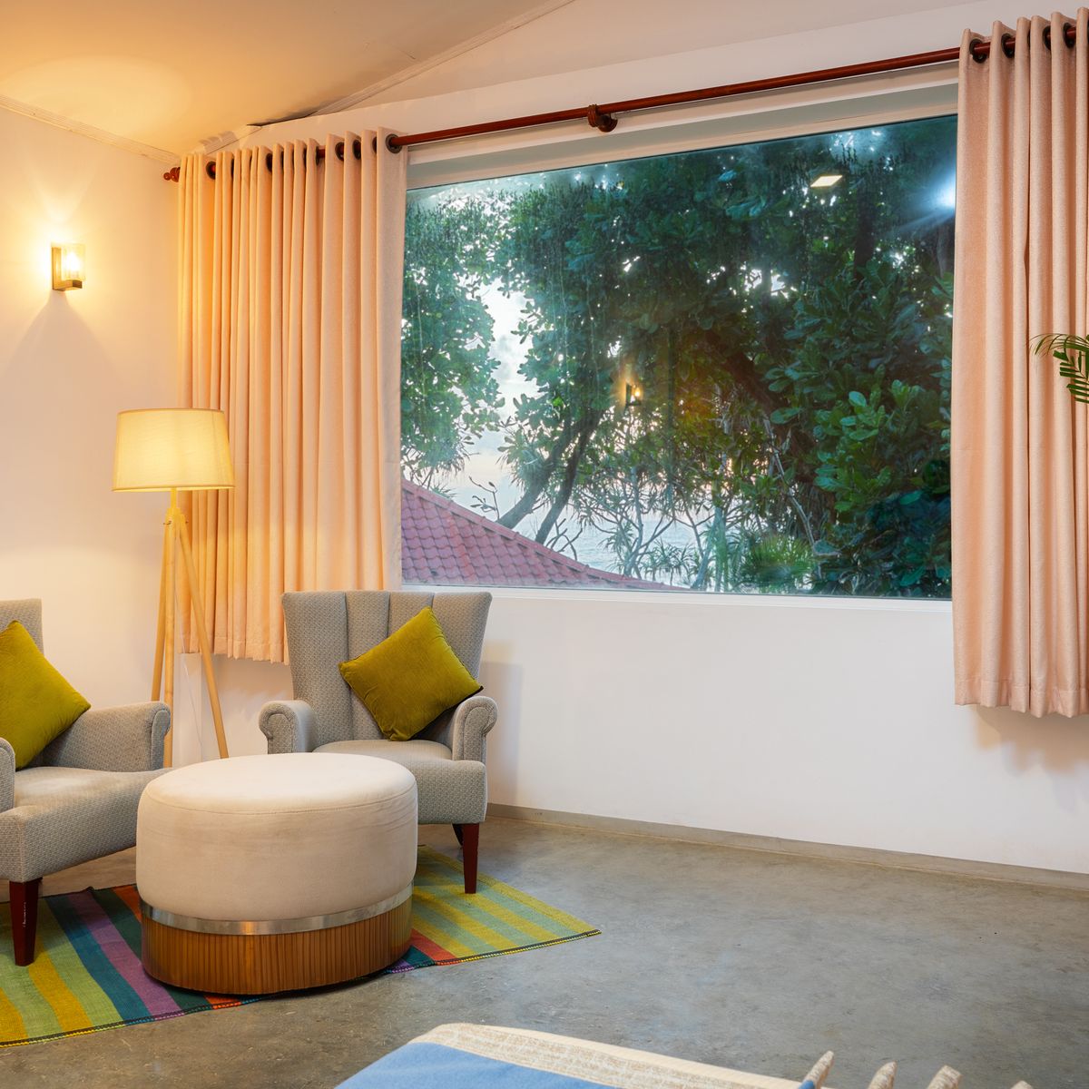 Das Hiru Om bietet insgesamt 12 Doppelzimmer (ca. 38 qm) verteilt auf zwei Etagen, jedes ausgestattet mit einem Balkon oder einer Terrasse, die einen herrlichen Blick auf den üppigen Garten und das Meer bieten (teilweise leicht seitlich). Die Zimmer zeichnen sich durch das einzigartige, stilvolle und sehr kreative "Hiru-Design" aus. Zur Ausstattung gehören eine Dusche/WC, Föhn, Telefon, Safe, Ventilator, Klimaanlage (gegen Gebühr), Moskitonetz und WLAN. Für das Wohlbefinden der Gäste sind ayurvedische Pflegeprodukte und eine Yogamatte verfügbar. Auf Fernseher wurde hier bewusst verzichtet. Einzelzimmer sind Doppelzimmer zur Alleinbenutzung.