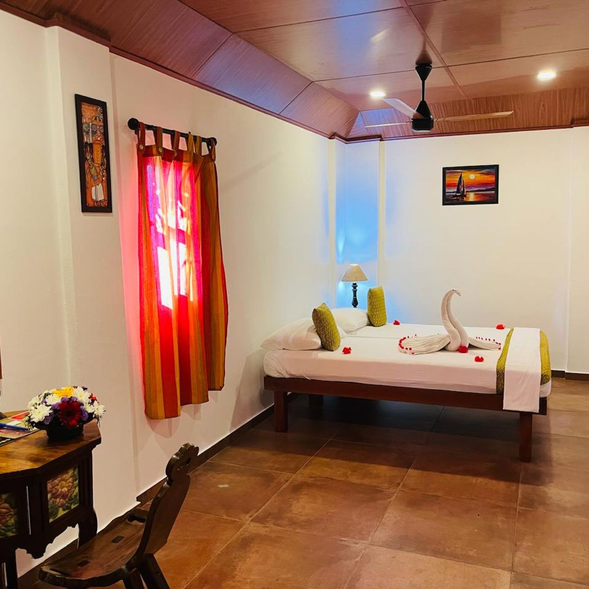4 freistehende, traditionell keralesische Doppelchalets sowie 2 großzügige Chalethäuser beherbergen 16 gemütliche, geräumige Doppelzimmer (auch als EZ=DZ). Großzügig auf dem Gelände verteilt, garantieren sie größtmögliche Privatsphäre und sind komfortabel mit Moskitonetz, Ventilator sowie einer großen Terrasse mit Sitzmöglichkeiten ausgestattet. Kerala Palace mit 4 weiteren Zimmern mit separatem Wohnzimmer und Balkon oder Terrasse. Auf Anfrage haben Sie die Möglichkeit einen Kühlschrank für Medikamente zu bekommen. WLAN in der Lobby.