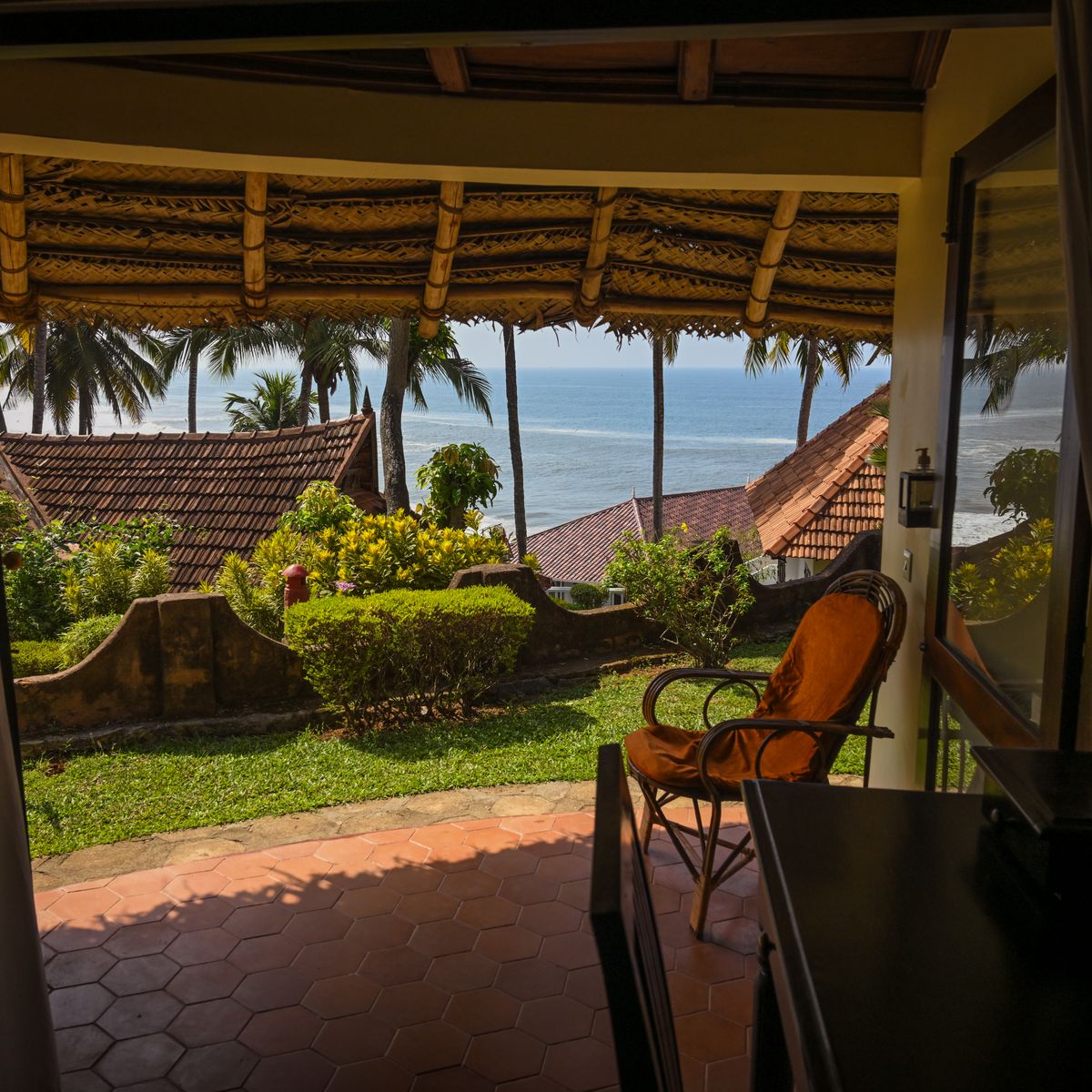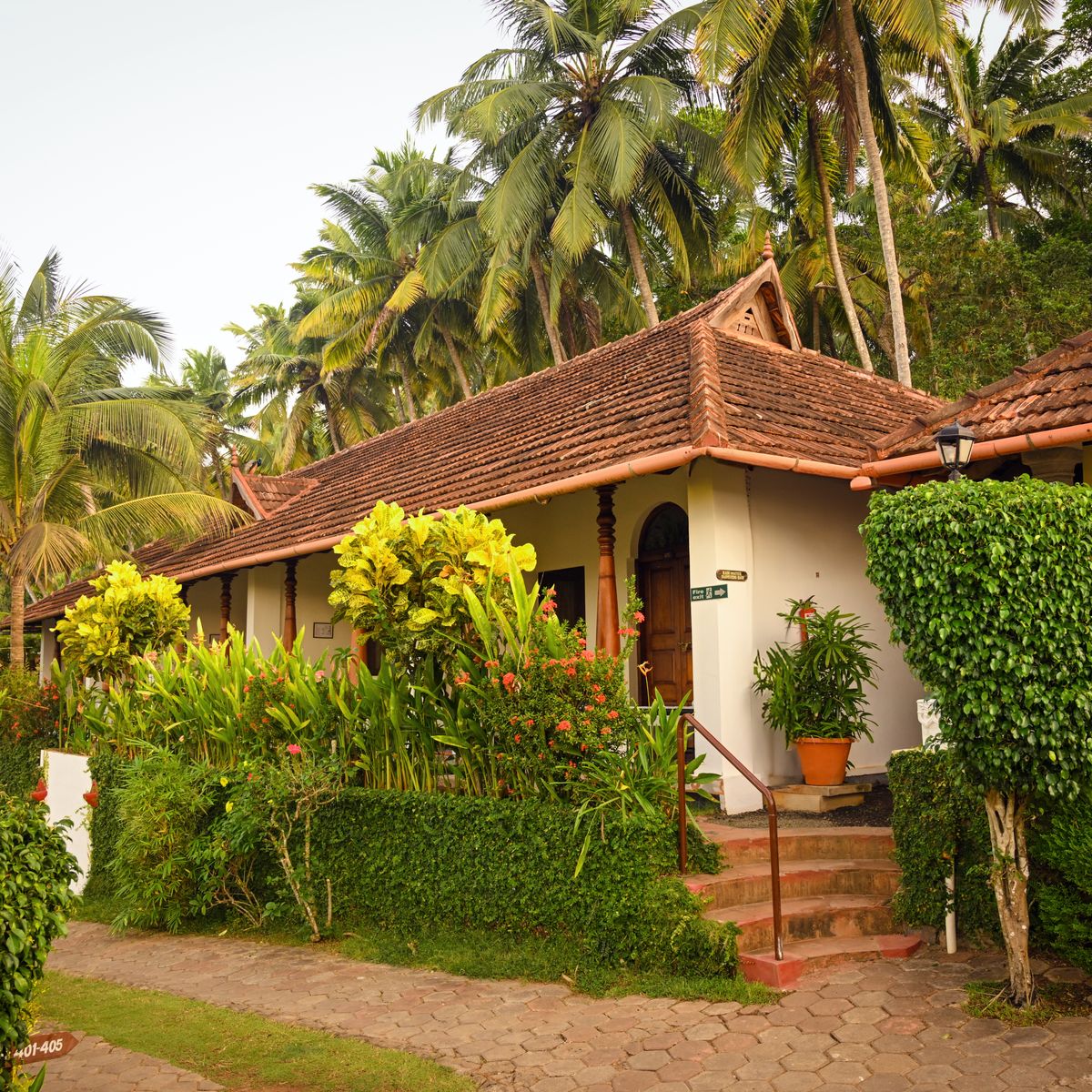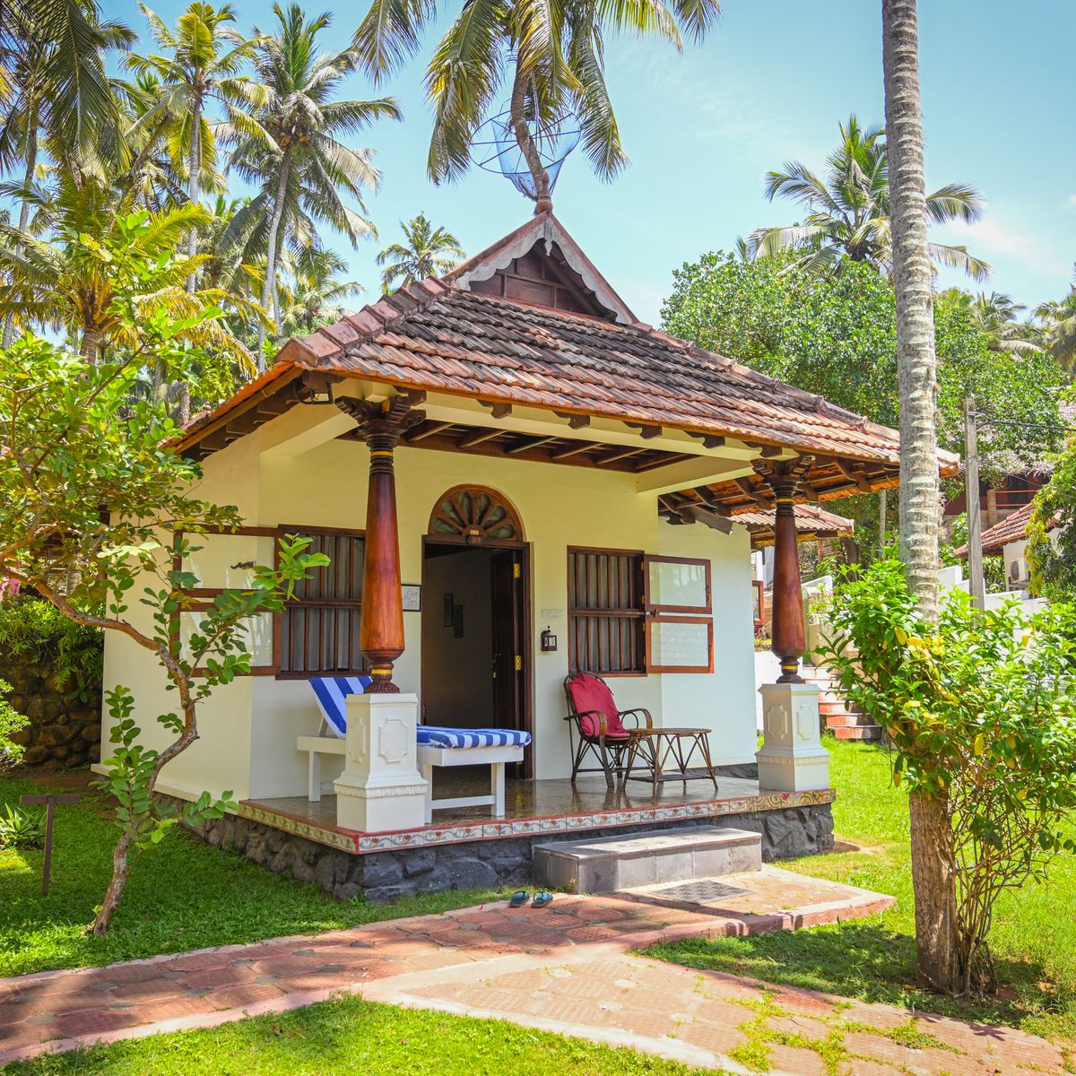 Im traditionellen Kerala-Stil gestaltete, teilweise freistehende Chalets mit Zugang zur Badebucht mit Sandstrand.