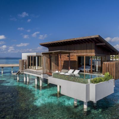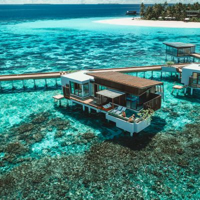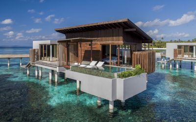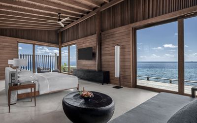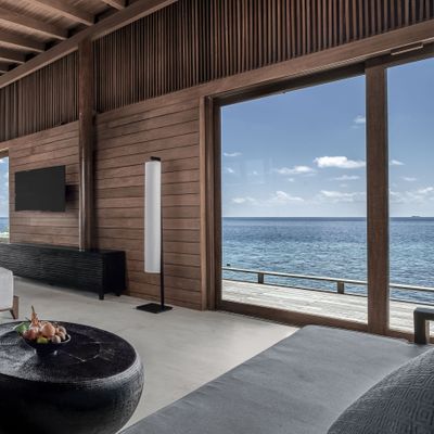 Overwater Villa mit traumhaftem 180°-Blick auf das Meer, privater Terrasse mit direktem Zugang zum Hausriff und Sonnenliegen. Ausgestattet mit digitalem Media-hub und Home-Entertainment-System.