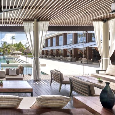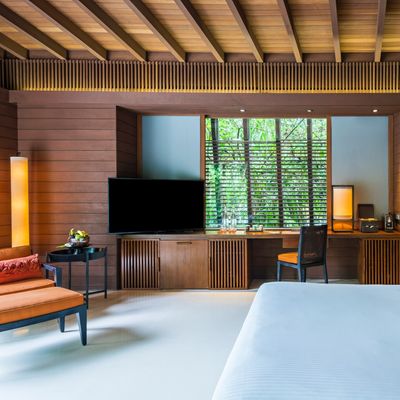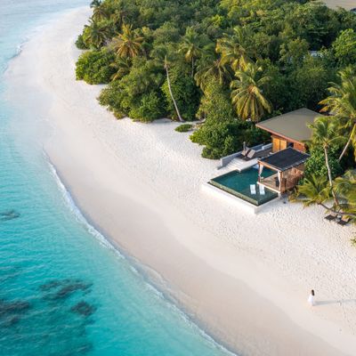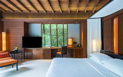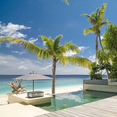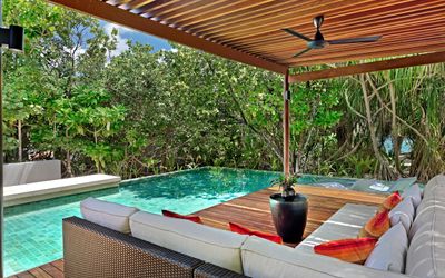 Beach Pool Villa mit Kingsize-Bett, Terrasse, Loungebereich, Plunge Pool, Sonnenliegen und direktem Strandzugang. Ausgestattet mit digitalem Media-hub und Home-Entertainment-System.