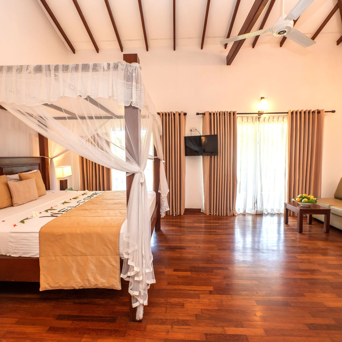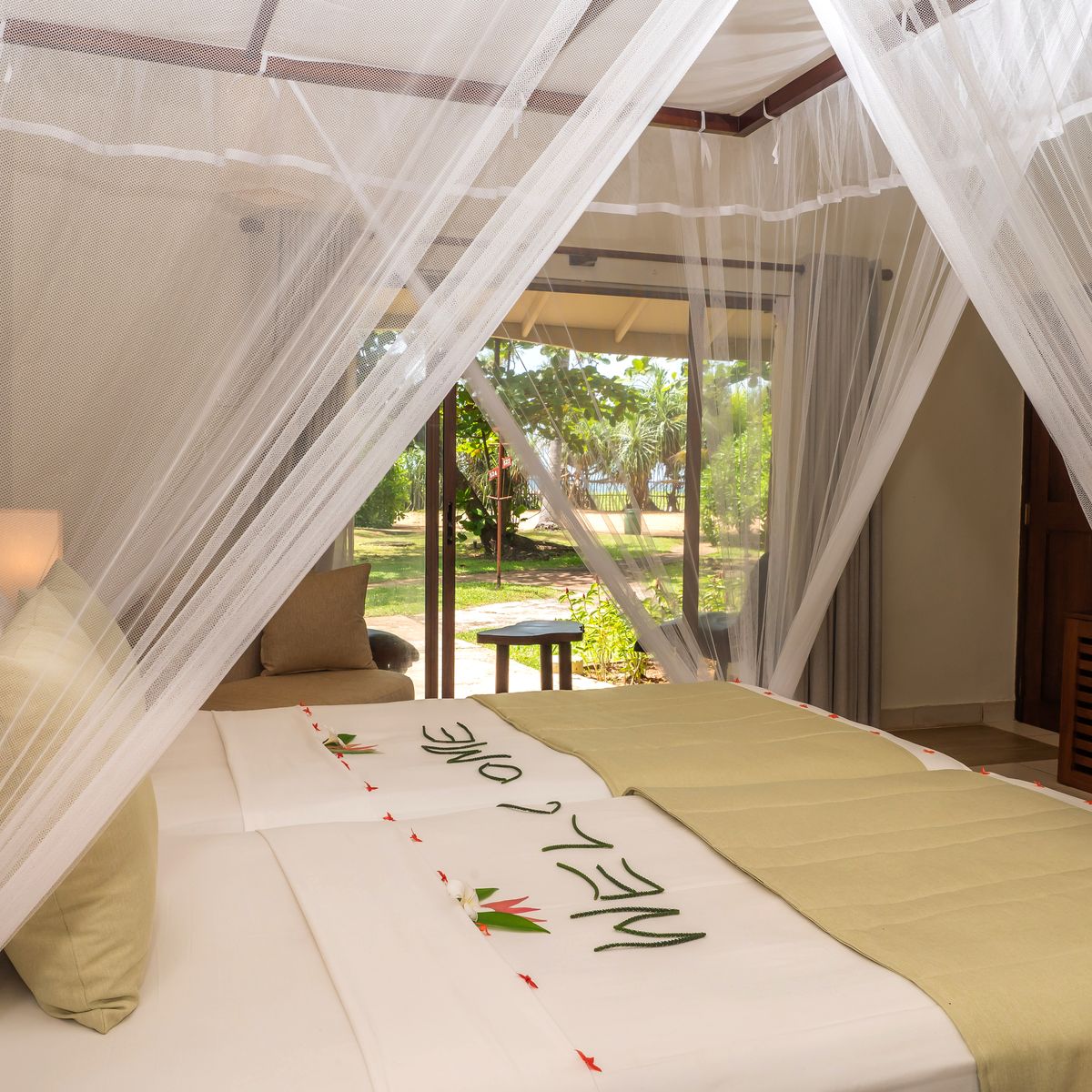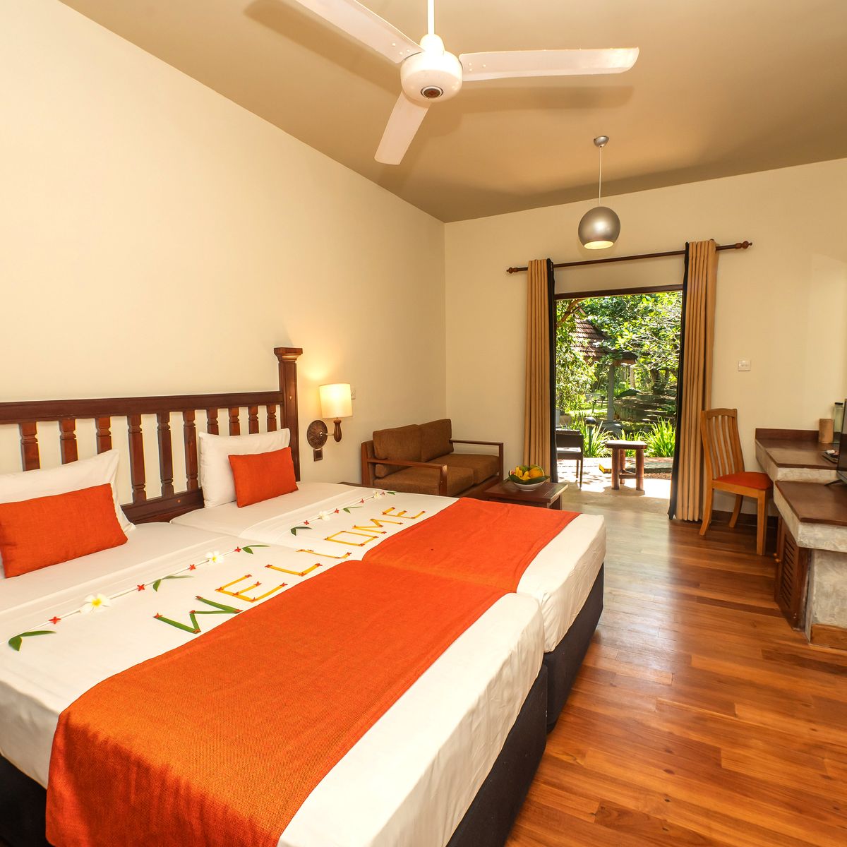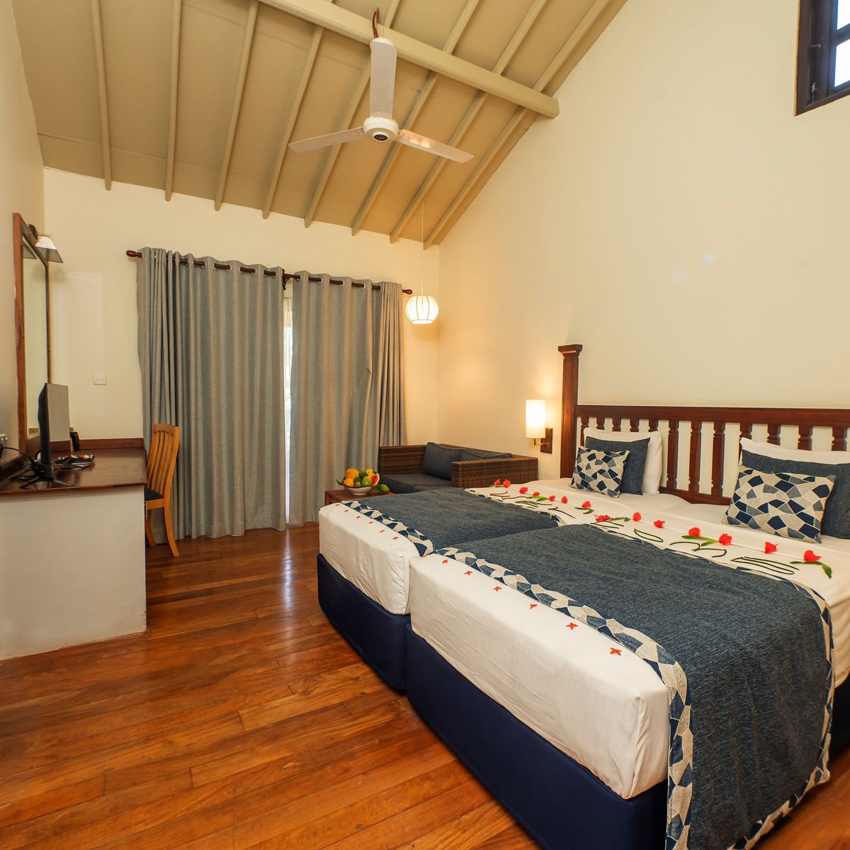 Das Resort verteilt seine 50 Zimmer auf mehrere ein- bis dreistöckige Gebäude, die harmonisch in die tropische Gartenlandschaft eingefügt sind. Jedes Zimmer präsentiert sich mit einem individuellen singhalesischen Thema, das dem Resort einen unverwechselbaren Charme verleiht. Die Ausstattung genügt westlichen Standards und umfasst einen komfortablen Sitzbereich, eine Regendusche sowie eine Klimaanlage. WLAN steht in der Lobby zur Verfügung. Kürzlich wurden die Zimmer in vielen Bereichen renoviert, was ihnen zusätzlichen Komfort und ein erfrischendes Ambiente verleiht. Die Superior Zimmer verfügen über eine Terrasse oder einen Balkon mit Blick auf die Pool- und Gartenlandschaft. Die Deluxe Zimmer laden mit einer Terrasse und Meerblick zum Verweilen ein. Die geräumigen Deluxe Suiten bieten eine große Terrasse oder einen Balkon und eröffnen entspannende Ausblicke auf die umliegende grüne Parkanlage. Einzelzimmer sind als Doppelzimmer zur Alleinbenutzung konzipiert.